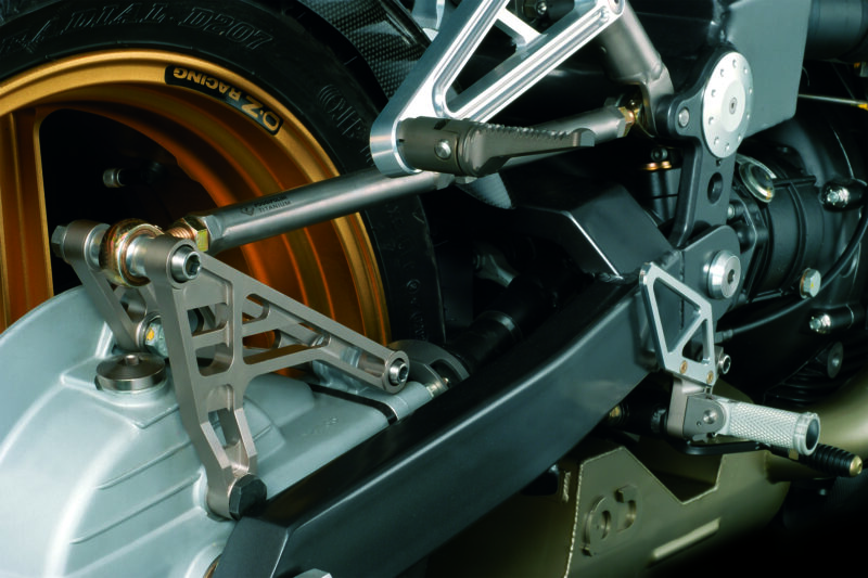 All the details are exclusive, the tank cap and the whole rear subframe are in titanium and the ignition key is in silver. All rear suspension components, the light subframe, the digital dashboard, the LED lights are exceptional design objects, the saddle and the handles are covered in suede.